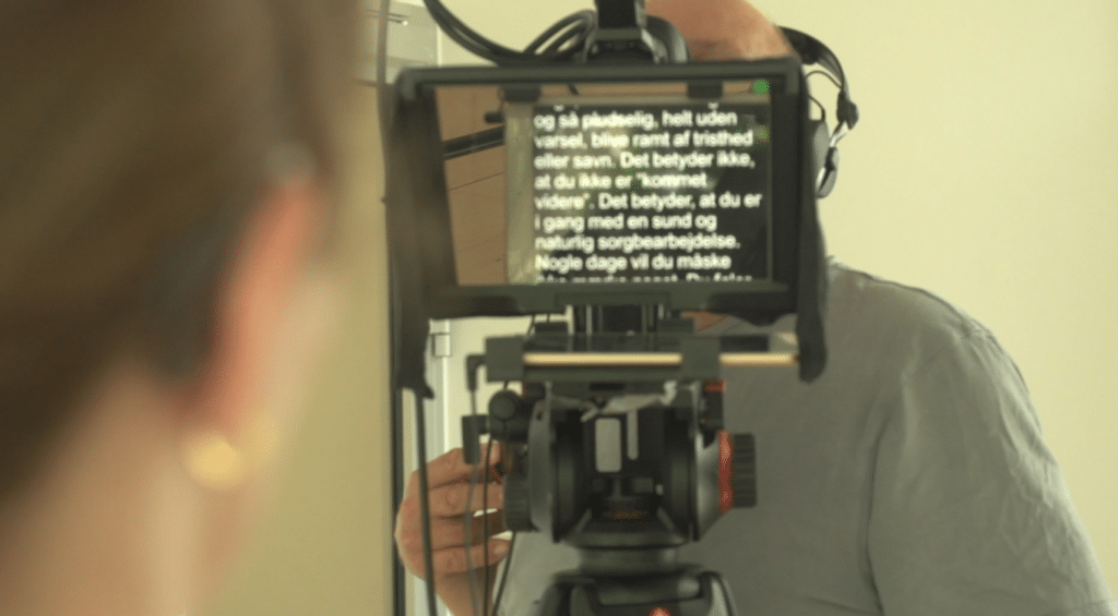 Når vi filmer fagpersoner, der gerne vil være sikre på deres budskab og fremtoning, så bruger vi ofte vores transportable teleprompter. Det eneste deltageren skal gøre er at skrive sit budskab ned og sende det til os før optagedagen. Så har vi det med på teleprompter, og det skaber ro og tryghed: